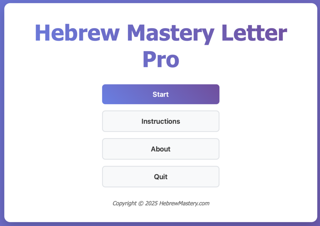Welcome to the Hebrew language practicing game, Hebrew Letter Pro. This game is designed to help you memorize the Hebrew alphabet in a short amount of time using a quiz format in order to remember the letters. The game features: