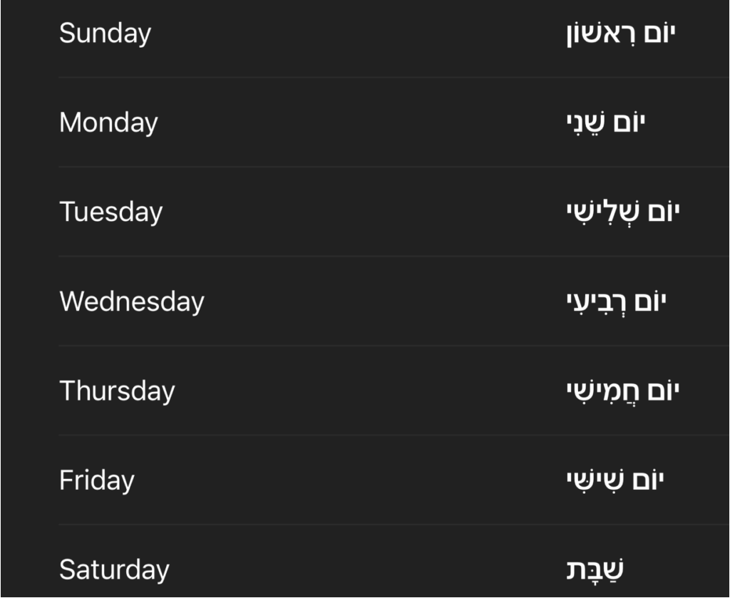 As mentioned in first paragraph, The meaning of the days from Sunday to Friday is the same as saying. “First day”,”Second day”,”Third day”, etc. So if you already know this you just add the word day (יום) to it.
